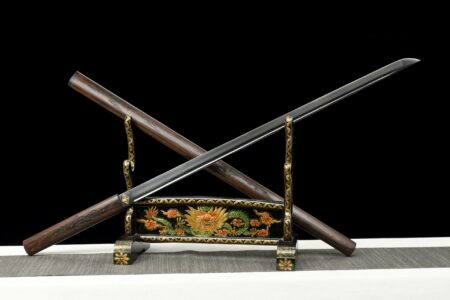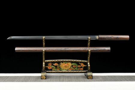 Le ninjato, sabre droit des shinobi du Japon féodal, forgé à la main en acier au carbone 1060 ou manganèse avec tsuba carrée et saya mate. Plus court et plus maniable qu’un katana classique.